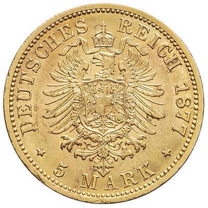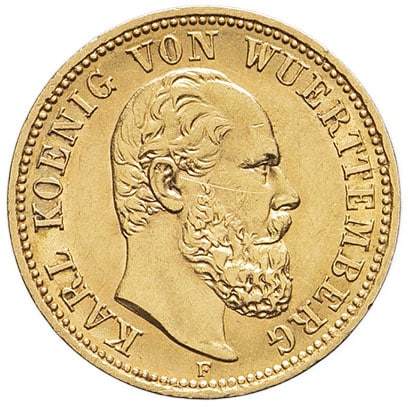 - GERMANY Wurtemberg, Charles (1864-1891). 5 mark 1877, F, Stuttgart.
