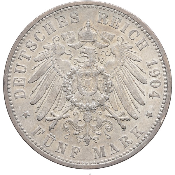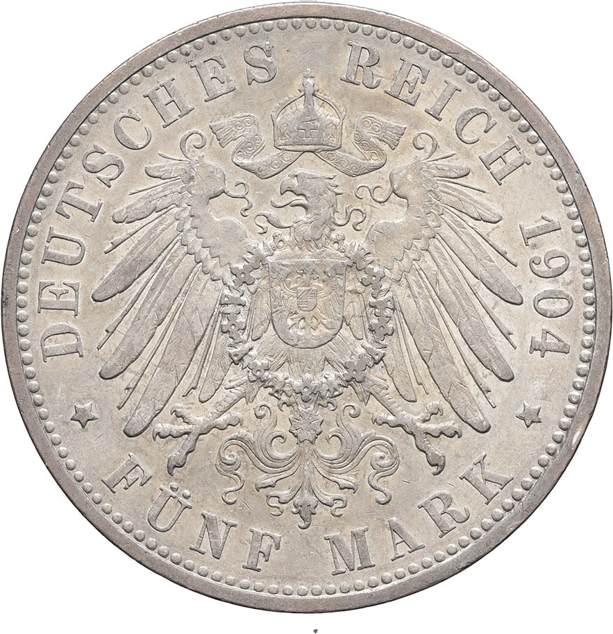 - GERMANY Wurtemberg, Guillaume II (1891-1918). 5 (fünf) mark 1904, F, Stuttgart.
