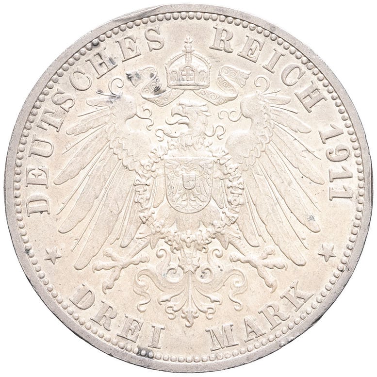 - GERMANY Wurtemberg, Guillaume II (1891-1918). 3 (drei) mark, noces d’argent 1911, F, Stuttgart.