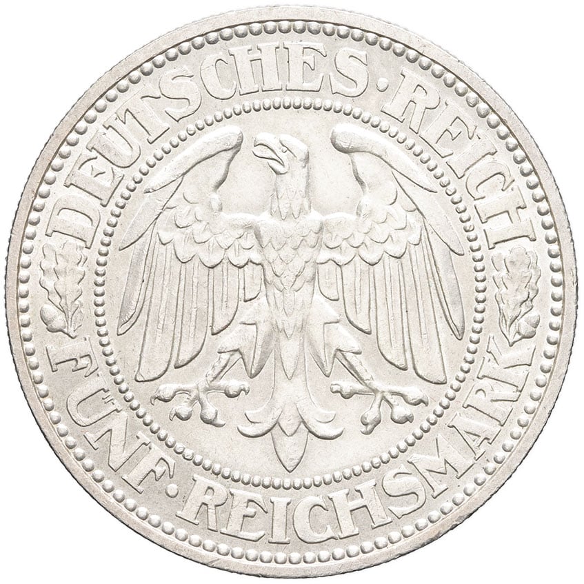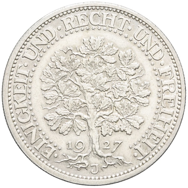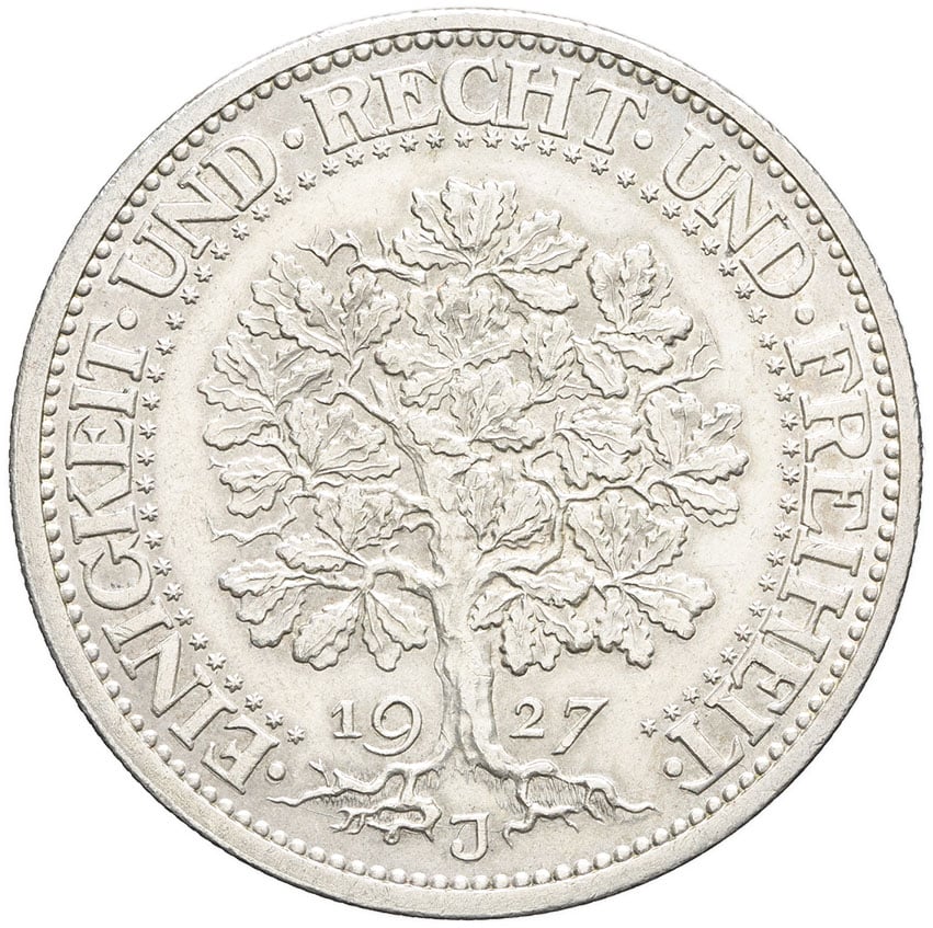 - GERMANY République de Weimar (Empire allemand) (1918-1933). 5 (fünf) reichsmark 1927, J, Hambourg.