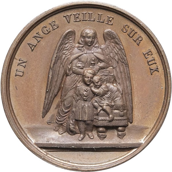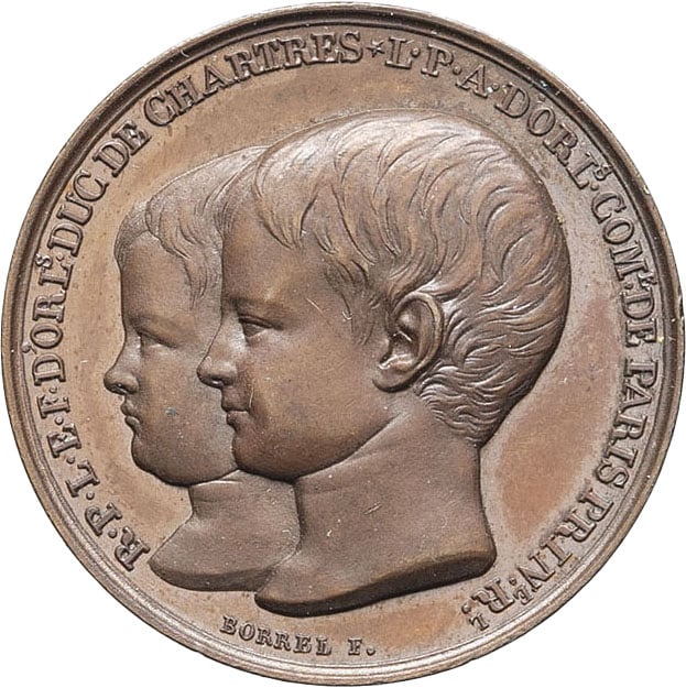 - Louis-Philippe Ier (1830-1848). Médaille, Louis-Philippe Albert d’Orléans comte de Paris et Robert Philippe Louis Eugène Ferdinand d’Orléans duc de Chartres, par Borrel ND (après 1845), Paris.