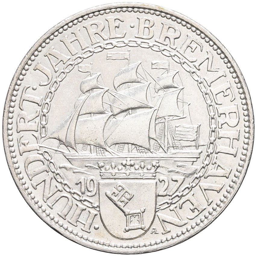 - GERMANY République de Weimar (Empire allemand) (1918-1933). 5 (fünf) reichsmark, centenaire de Bremerhaven 1927, A, Berlin.