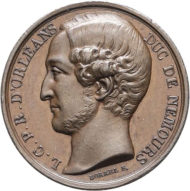 - Louis-Philippe Ier (1830-1848). Médaille, Louis-Charles-Philippe-Raphaël d’Orléans duc de Nemours, hommage à Ferdinand-Philippe duc d’Orléans, par Borrel 1845, Paris.