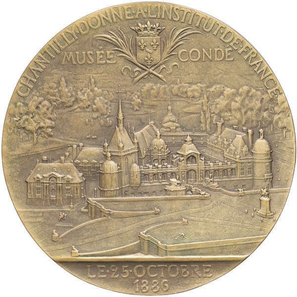 - IIIe République (1870-1940). Médaille, Henri d’Orléans duc d’Aumale lègue le château de Chantilly et le Musée Condé à l’Institut de France, par Chaplain 1886, Paris.