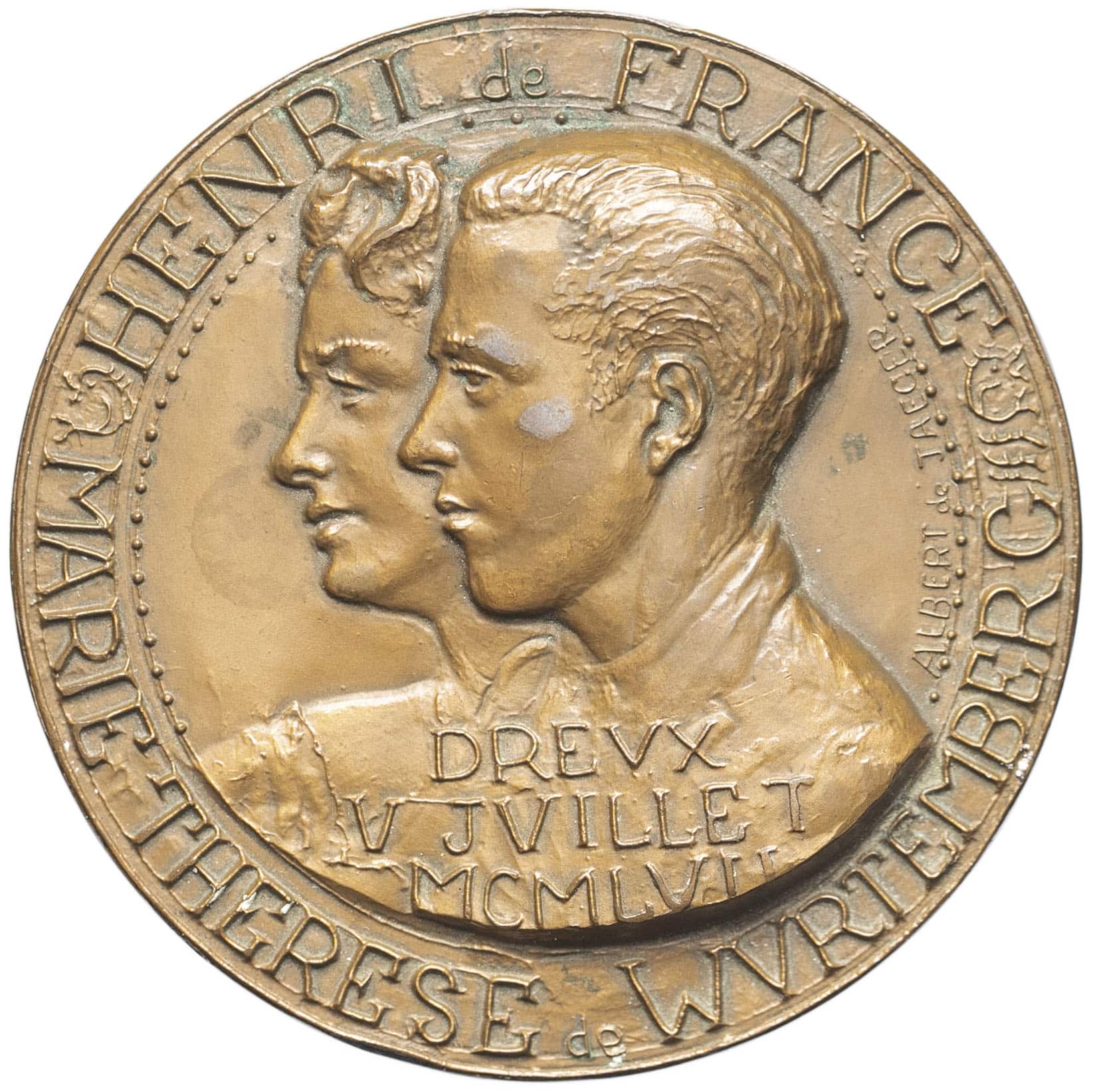 - IVe République (1947-1958). Médaille, mariage d’Henri VIII de France duc d’Orléans et Marie-Thérèse de Wurtemberg, par De Jaeger 1957, Paris.