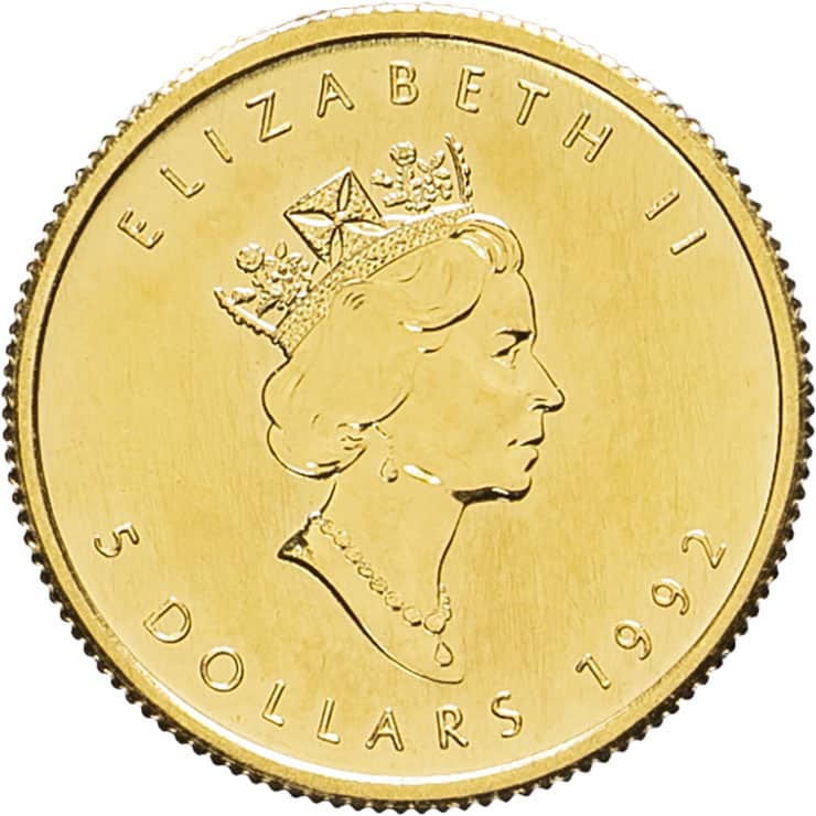 - Élisabeth II (1952-2022). 5 dollars ou 1/10 once maple leaf 1992, Ottawa.