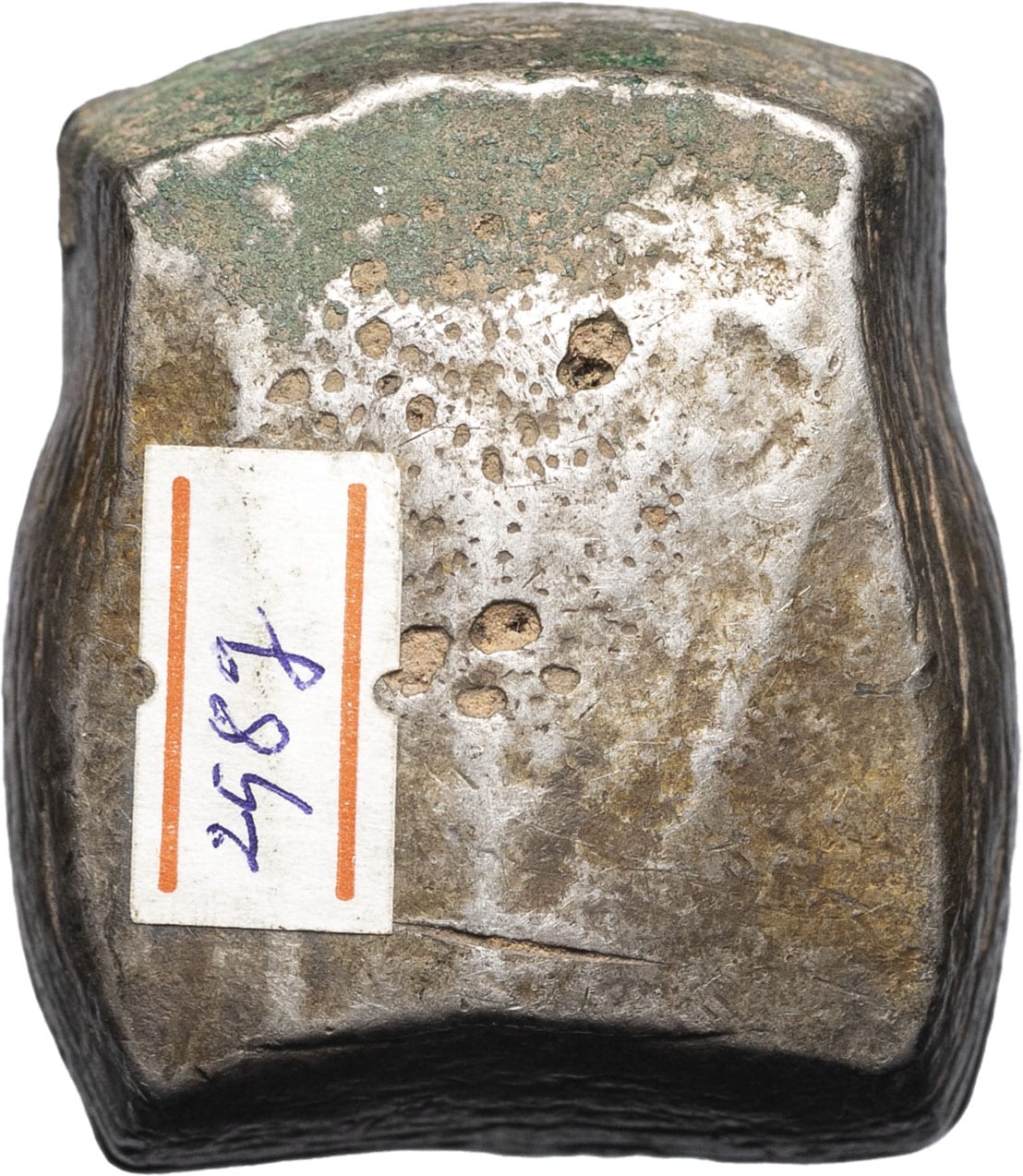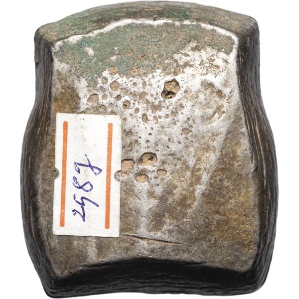 Poinçonné trois fois “Dao Guang Shiyi Nian” (11e année de Dao Guang). Appellation commune de 10 taels, bien que le poids correspondrait à 8 taels. Quelques concrétions dans les contremarques, une étiquette avec le poids collé au dos. TTB à Superbe.