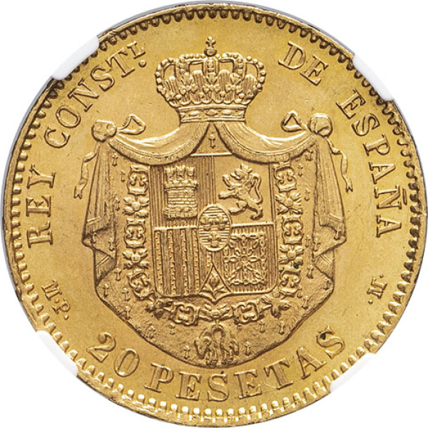 Rv. REY CONSTl DE ESPANA. Écu couronné entre les deux colonnes avec banderole PLUS ULTRA. Au-dessous (essayeur) 20 PESETAS (atelier).