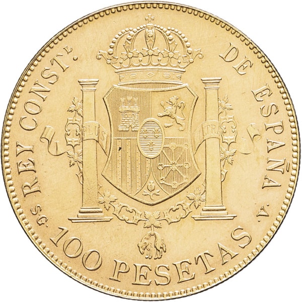 Rv. REY CONSTl - DE ESPANA. Écu couronné entre les deux colonnes avec banderole PLUS ULTRA et le bijou de la Toison d’Or. Au-dessous (essayeur) 100 PESETAS (atelier).