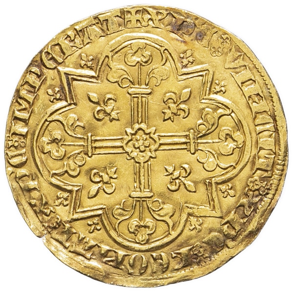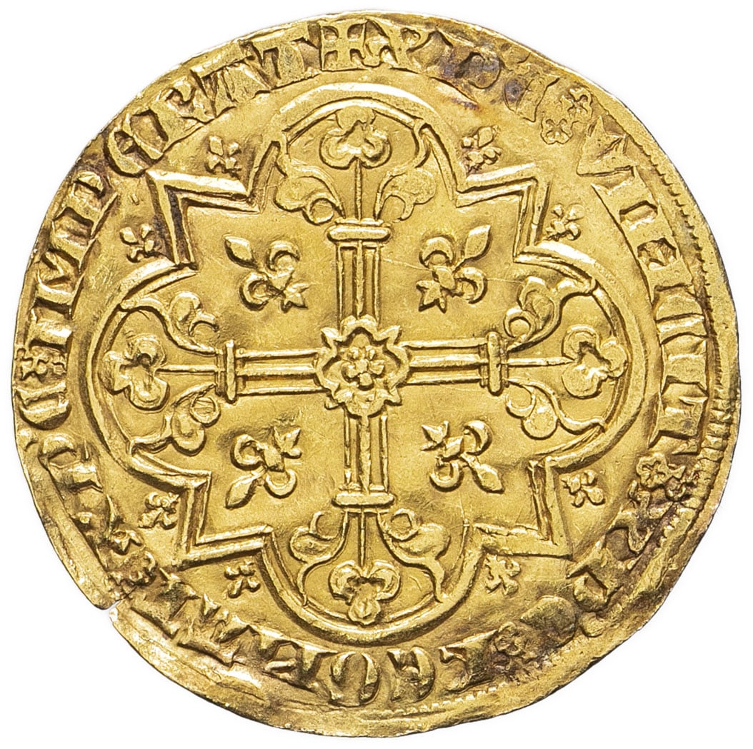 Rv. + XP'C: VINCIT: XP'C: REGNAT: XP'C: IMPERAT, ponctuation par 2 quadrilobes superposés. Croix tréflée et feuillue, avec en cœur une rose dans un petit quadrilobe anglé, accosté de quatre lis, dans un quadrilobe anglé cantonné de huit petits lis.