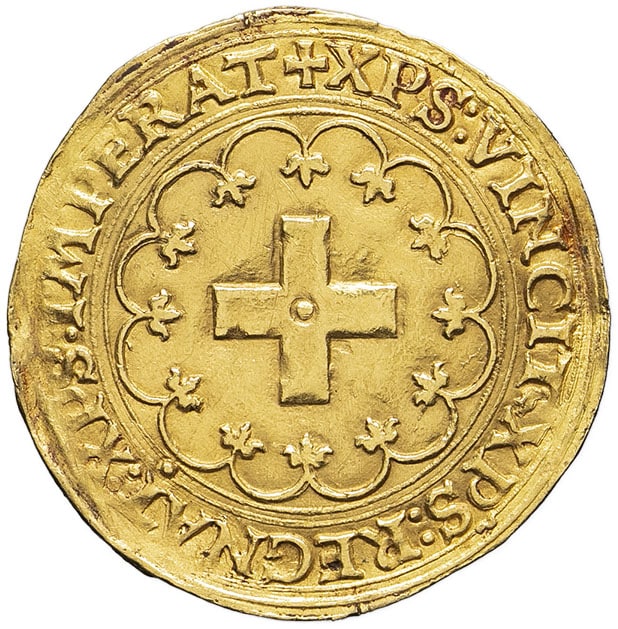 Rv. + XPS. VINCIT. XPS. REGNAT. XPS IMPERAT (différent) (atelier). Croix plaine alésée, dans un polylobe feuillu.