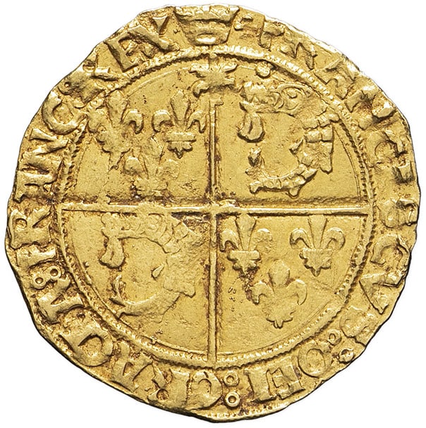 Av. (couronnelle) (différent) FRANCISCVS: DEI: GRA: FRANCOR: REX. Champ écartelé de France-Dauphiné ; en haut, un soleil.