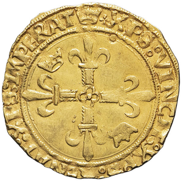 Rv. (couronnelle) (différent) XPS: VINCIT: XPS: RENAT: XPS: IMPERAT. Croix fleurdelisée avec quadrilobe en cœur, cantonnée de deux couronnelles.