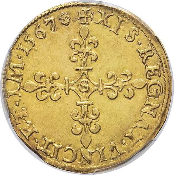 - FRANCE / ROYAL Charles IX (1560-1574). Écu d’or au soleil, 1er type 1567, G, Poitiers.