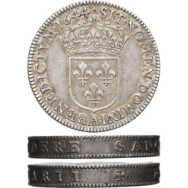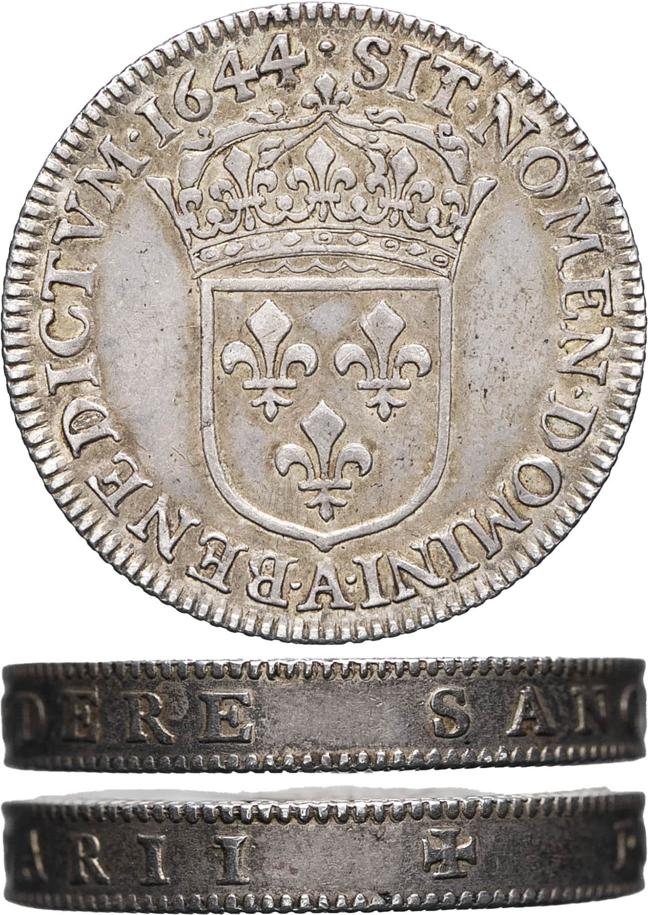 - FRANCE / ROYAL Louis XIV (1643-1715). Piéfort quadruple du quart d’écu à la mèche courte 1644, A, Paris.