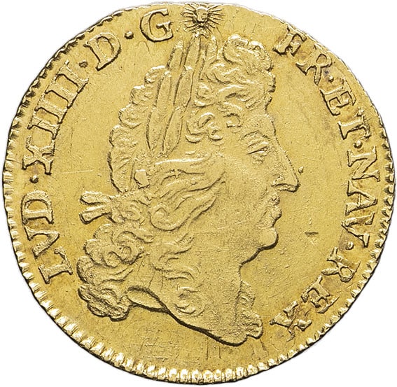 Av. LVD. XIIII. D. G (soleil) - FR. ET. NAV. REX. Tête âgée du Roi à droite, avec une perruque laurée.