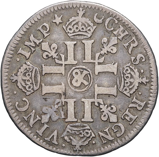 Rv. (différent) CHRS - REGN - VINC - IMP (différent). Croix formée de huit L adossées, chaque bras étant couronné, avec (atelier) en cœur, cantonnée de quatre lis.