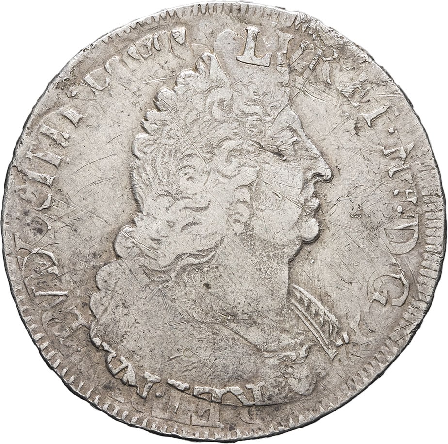 Av. LVD. XIIII. D. G (soleil) - FR. ET. NAV. REX. Buste à droite du Roi, cuirassé à l’antique.