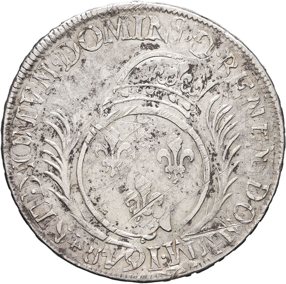 Rv. (différent). SIT. NOMEN. DOMINI - BENEDICTVM (différent) (date). Écu de France rond, couronné, entre deux palmes ; (atelier) à l’exergue.