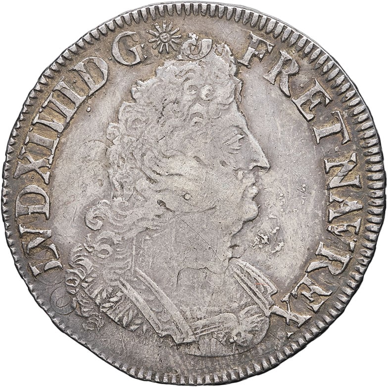 Av. LVD. XIIII. D. G (soleil) - FR. ET. NAV. REX. Buste à droite du Roi, cuirassé à l’antique.