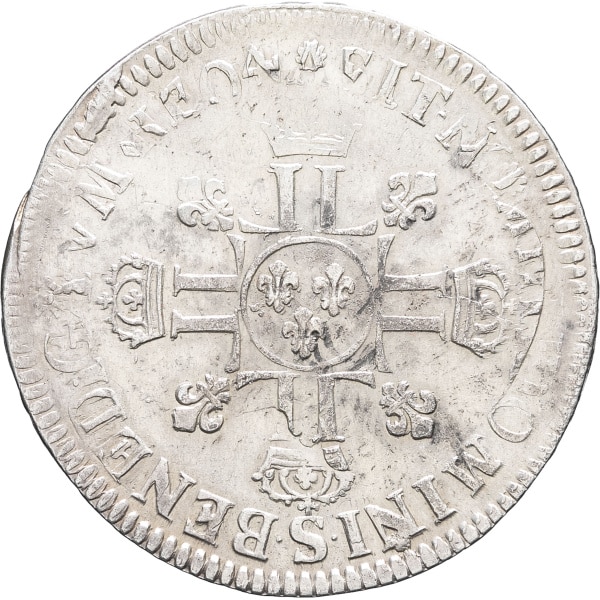 Rv. (différent) SIT. NOMEN. DOMINI. BENEDICTVM (différent) (date). Croix formée de huit L adossées, chaque bras étant couronné, avec trois lis posés 2 et 1 dans un cercle en cœur, cantonnée de quatre lis divergeant du centre ; à l’exergue (atelier).