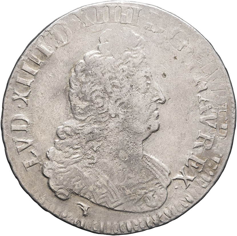 Av. LVD. XIIII. D. G (soleil) - FR. ET. NAV. REX. Buste à droite du Roi, cuirassé à l’antique.