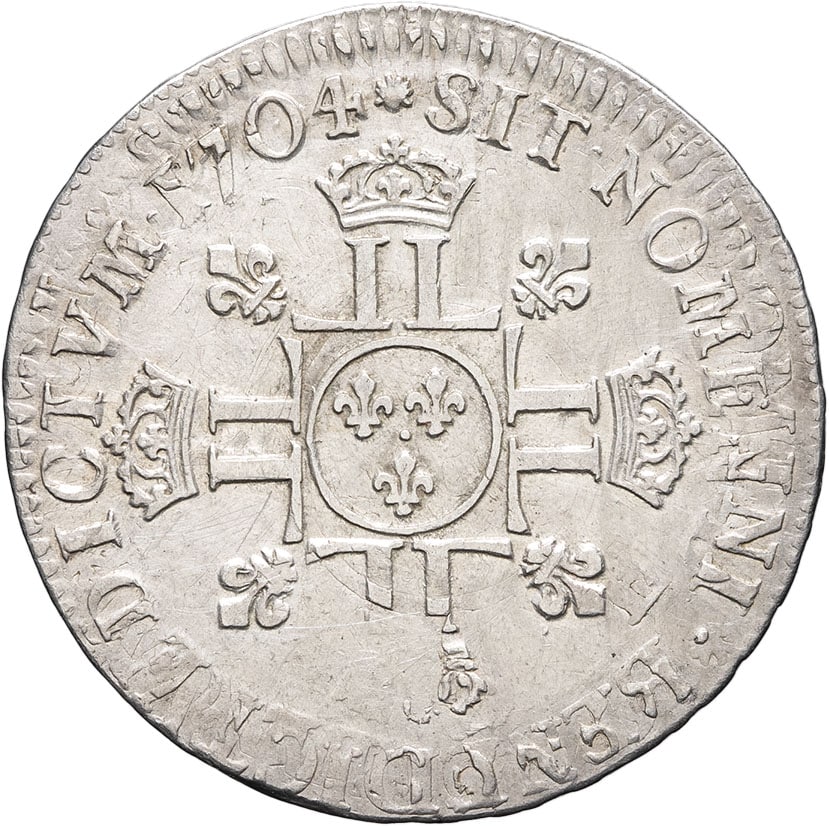 - FRANCE / ROYAL Louis XIV (1643-1715). Demi-écu aux huit L, 2e type, buste du type aux palmes 1704, D, Lyon.