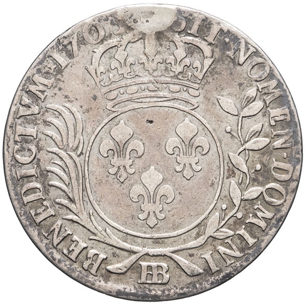 Rv. SIT. NOMEN. DOMINI - BENEDICTVM (différent) (date). Écu de France rond, couronné, entre une palme et un rameau d’olivier ; à l’exergue (atelier).
