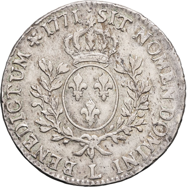 Rv. SIT. NOMEN. DOMINI. BENEDICTUM (différent) (date). Écu de France ovale, couronné, entre deux rameaux d’olivier ; au-dessous (atelier).