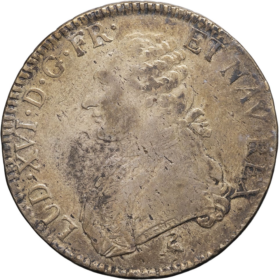 Av. LUD. XVI. D. G. FR. ET NAV. REX. Buste du Roi à gauche, portant une veste brodée, avec l’ordre du Saint-Esprit, les cheveux noués sur la nuque par un ruban. Signature B. DUVIV. F. sur la tranche du buste ; au-dessous (différent).