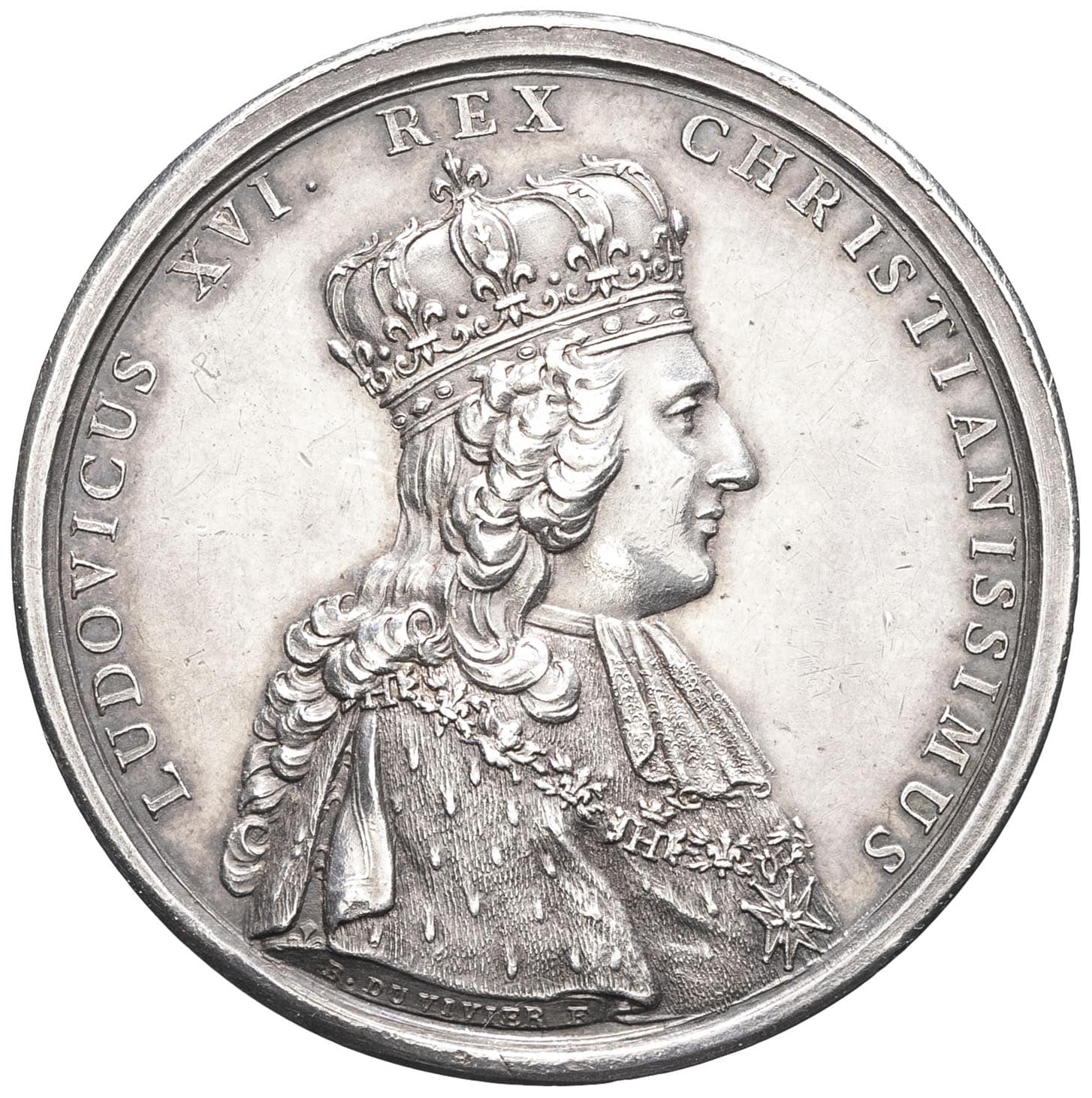 Av. LUDOVICUS XVI. REX CHRISTIANISSIMUS. Buste à droite du Roi, couronné, en manteau d'hermines, avec le collier de l'ordre du Saint-Esprit et une cravate ; signature B. DUVIVIER F.