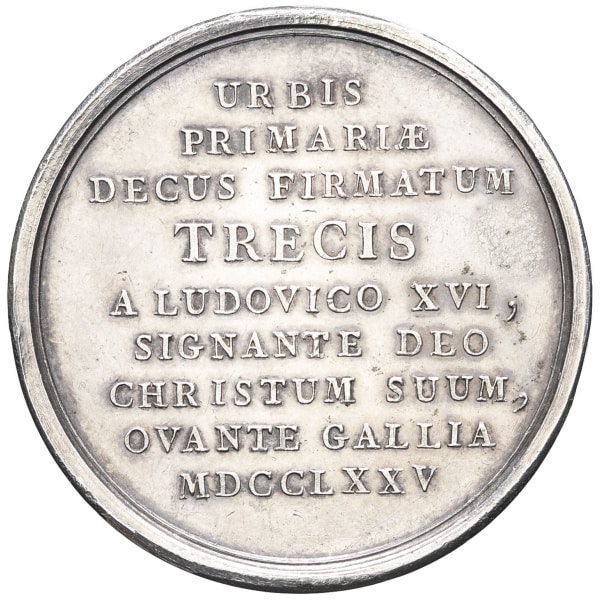 Rv. Inscriptions en neuf lignes : URBIS/ PRIMARIÆ/ DECUS FIRMATUM/ TRECIS/ A LUDOVICO XVI,/ SIGNANTE DEO/ CHRISTUM SUUM,/ OVANTE GALLIA/ MDCCLXXV.