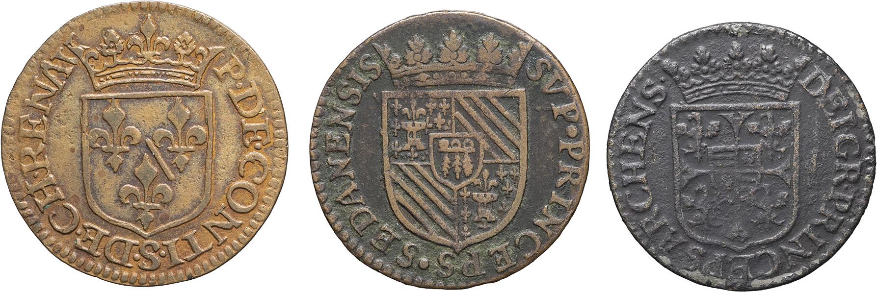 Lot de 3 liards : Arches 1614, Château-Regnault 1613, Sedan 1614. TB à TTB.