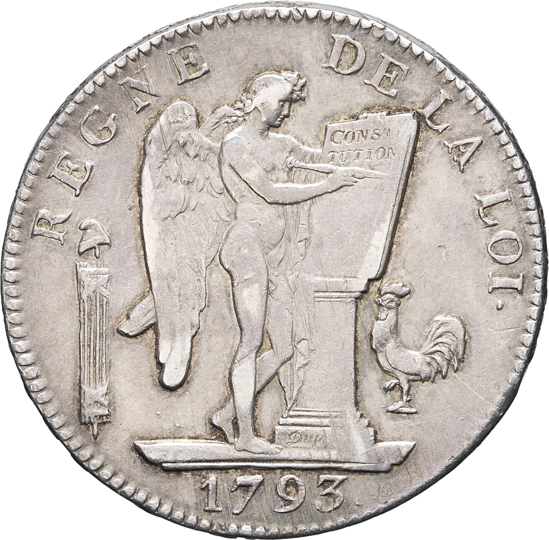 Rv. REGNE DE LA LOI. Le Génie de la France gravant le mot CONSTITUTION (en deux lignes) sur une table de la loi reposant sur un autel, accosté d’un faisceau à gauche et d’un coq à droite. Signature cursive DUPRÉ en creux sur la base de l’autel ; à l’exergue (date).