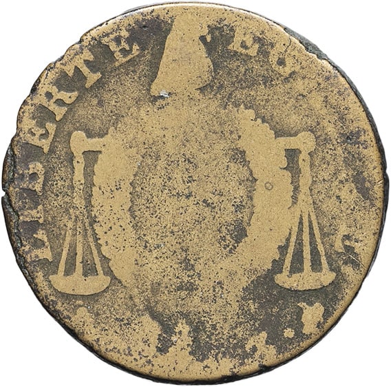 Rv. LIBERTE EGALITE. Fléau d’une balance surmonté d’un bonnet de la liberté, sur lequel est une couronne avec au centre : 1/2 S ; au-dessous (atelier) et (différent) (date) (différent).