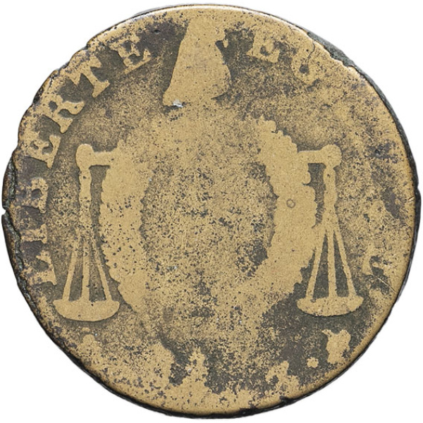 Rv. LIBERTE EGALITE. Fléau d’une balance surmonté d’un bonnet de la liberté, sur lequel est une couronne avec au centre : 1/2 S ; au-dessous (atelier) et (différent) (date) (différent).
