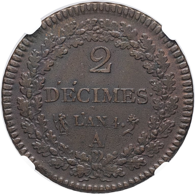 Rv. Dans une couronne formée de deux branches de chêne : 2 DÉCIMES. L’AN (date). (différent) (atelier) (différent).