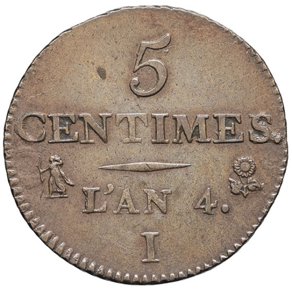 - Directoire (1795-1799). Cinq centimes Dupré, petit module An 4 (1795), I, Limoges.