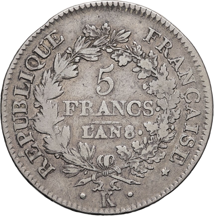 - Consulat (1799-1804). 5 francs Union et Force An 8 (1800), K, Bordeaux.