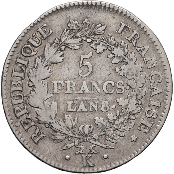 - Consulat (1799-1804). 5 francs Union et Force An 8 (1800), K, Bordeaux.