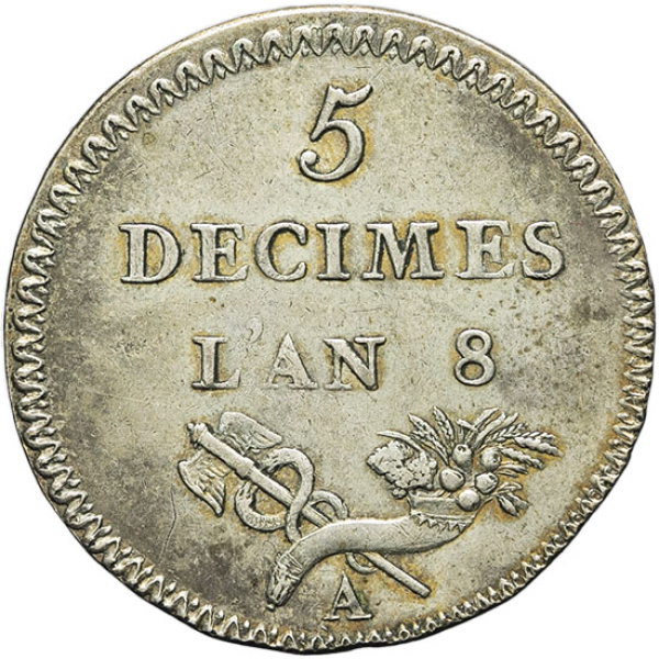 Rv. Caducée et corne d'abondance posés en sautoir, au-dessus 5 DECIMES L'AN 8, et au-dessous (atelier).