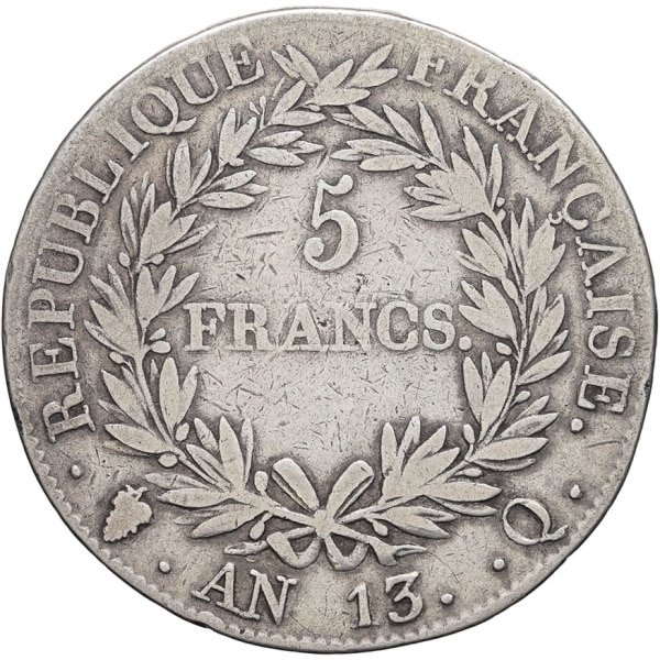 - Premier Empire / Napoléon Ier (1804-1814). 5 francs tête nue, calendrier révolutionnaire An 13 (1805), Q, Perpignan.