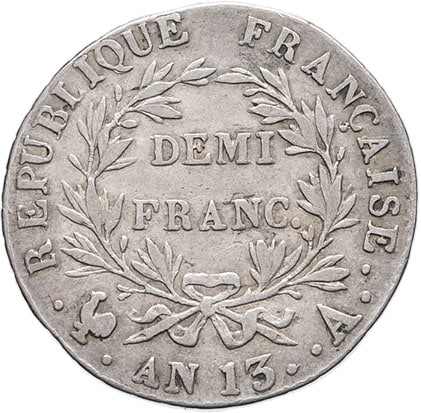 - Premier Empire / Napoléon Ier (1804-1814). Demi-franc calendrier révolutionnaire An 13 (1805), A, Paris.