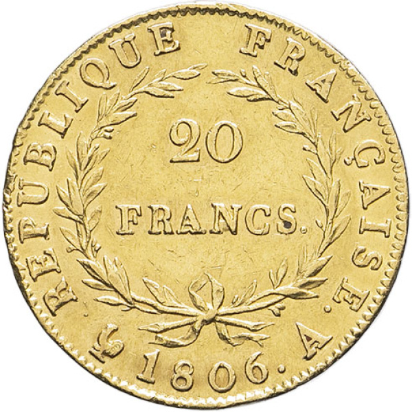 - Premier Empire / Napoléon Ier (1804-1814). 20 francs tête nue, calendrier grégorien 1806, A, Paris.