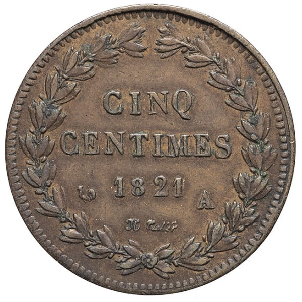 - Louis XVIII (1814-1824). Essai de cinq centimes 1821, A, Paris.