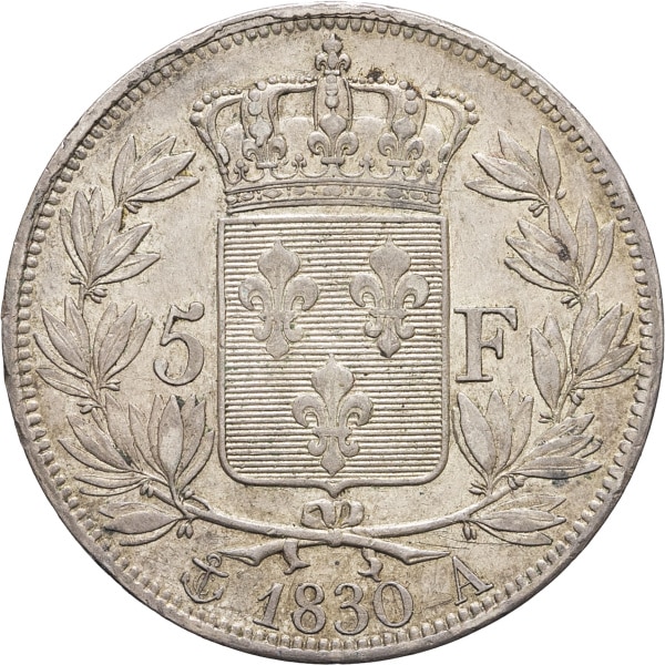 - Charles X (1824-1830). 5 francs, 2e type, gravure satirique en jésuite 1830, A, Paris.