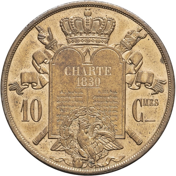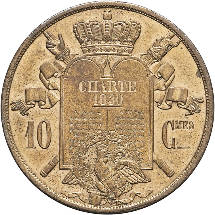 - Louis-Philippe Ier (1830-1848). Essai de 10 centimes à la Charte, par Barre 1847, Paris.