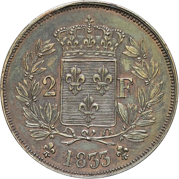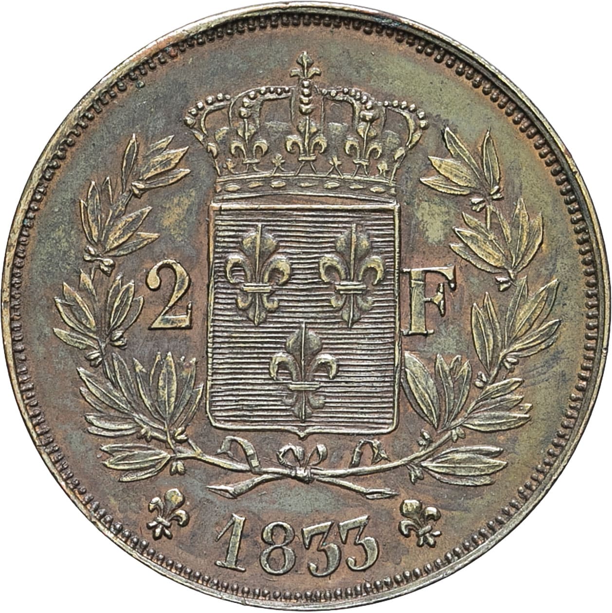 - Henri V (1820-1883). 2 francs 1833, épreuve en cuivre, tranche lisse 1833, Bruxelles (Würden).