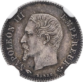 Av. (différent) NAPOLEON III - EMPEREUR (différent). Tête nue à gauche ; au-dessous signature BARRE.