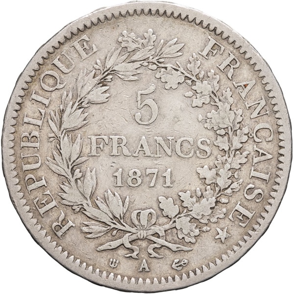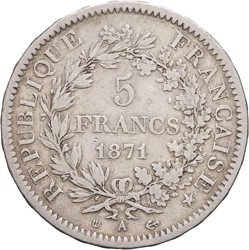 - Gouvernement de Défense Nationale (1870-1871). 5 francs Hercule, Camélinat 1871, A, Paris.